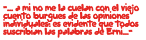 Pero si antes disimulaban un poco ante la peña su condición de propagandistas de la globalización, aquí se les había caído la careta. El autor del artículo era un tal Ernesto, aunque a mí no me engañan con el viejo cuento burgués de las opiniones individuales: es evidente que todos los autores del blog suscribían cada una de las palabras de Erni. Vamos, que se notaba mazo que estaban todos a favor de la invasión de Irak y de los ataques contra el pueblo palestino.
